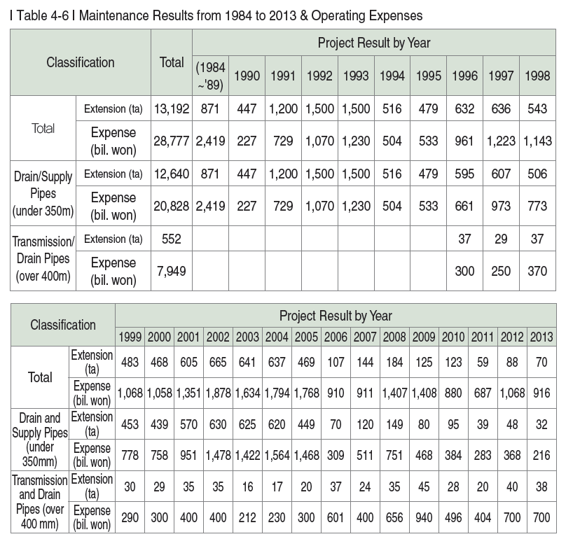 From 1984 when maintenance works on drain and supply pipes began in full swing, we established a comprehensive maintenance plan and invested 2.8777 trillion won to replace 96.5% or 13,192km of the 13,668km old pipes until 2013. The remaining 476km old pipes will be fully replaced by 2018.
