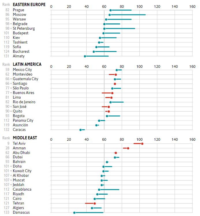 Currency fluctuations drive other changes in the ranking. After Uzbekistan allowed the som to float freely last September, it lost nearly half of its value. Sure enough, Tashkent, its capital, fell by 35 places in this year’s table, to 112th. Cairo, which dropped by 22 spots and narrowly avoided joining the bottom ten, faced a similar depreciation after the Egyptian central bank allowed the country’s pound to float in November 2016.