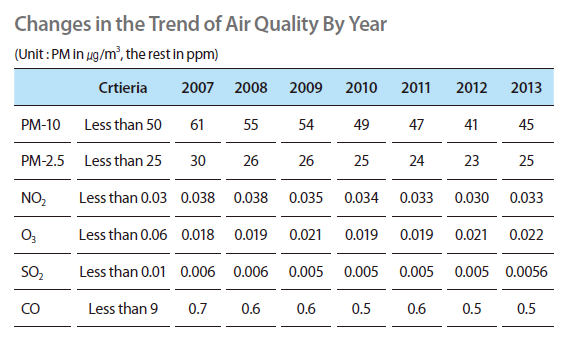Since the city government began taking an anti-pollution action in earnest in 2003, the air quality of Seoul showed a gradual improvement. The concentration of fine dust (PM-10) and ultrafine particles (PM-2.5) decreased over time with the exception of a slight increase in 2013 and 2014. The concentration of nitrogen dioxide (NO2) which is the major source of ultrafine particles decreased gradually while concentrations of sulfurous acid and carbon monoxide dropped to 1/3 of the standard set by the Ministry of Environment.
