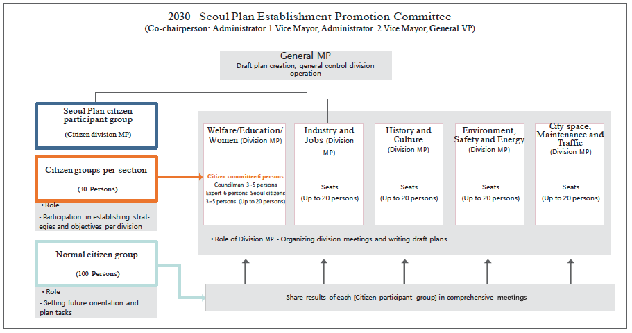 In accordance with the 2030 Seoul Plan, the “2030 Seoul Plan Development Committee” was founded to establish the plan within a collaborative network and framework of citizens, experts, administrators, and other interested parties. The committee was comprised of the Seoul Plan Citizens’ Group that shapes the vision, and of sub-committees that help develop the plans for key issues.