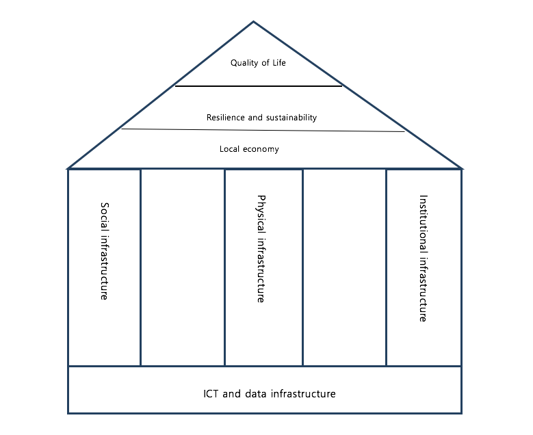 Figure 23 might depict how the city has strived to achieve the values subscribed by the citizens the contemporary global urban communities alike, including local economic well-being, sustainability, resilience and the quality of life. Illustrative policy responses and some of the key performance indicators seem to suggest that a large part of the urban investment was made in the area of infrastructure building. Whereas the infrastructures associated with the current discussion tended to focus on the physical and virtual infrastructures, due largely to the limited space and scope, the city underwent another set of compressed processes of developing and advancing social and institutional infrastructures. A wider and closer view will better illustrate how important it has been in Seoul’s express passage through development of late to build smart infrastructures in all four areas of physical, social, institutional and information.