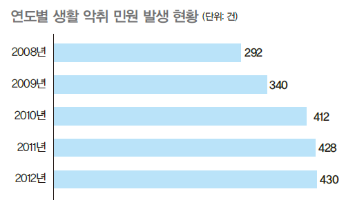 2008년에 292건이었던 생활 악취 문제 민원이 2012년에는 430건으로 약 65%가 증가했다. 특히 2012년 기준 5월부터 10월까지의 기간에 75%에 해당하는 359건의 민원이 집중적으로 발생했다.