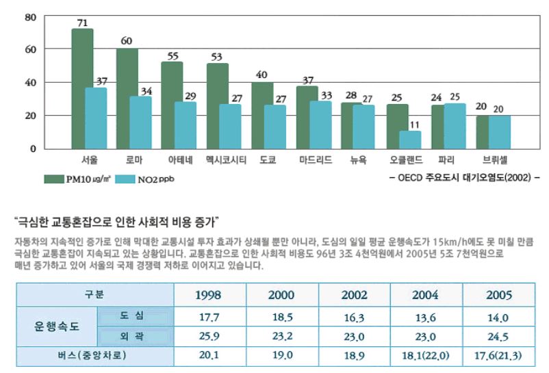 서울은 자동차의 증가로 전체 대기오염물질 배출량 중 교통분야의 오염물질 배출량이 63%를 차지하고 있어 자동차에서 배출되는 대기오염물질은 시민의 건강을 위협하는 주요 요인이라 할 수 있다.