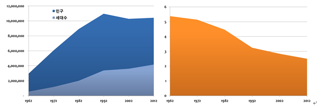 <그림1> 서울시 인구수와 새대수 변화 (좌) 서울시 세대당 인구변화 (우)