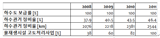 1990년대에는 도시환경기초시설로서의 하수관거의 기능회복을 위한 사업들이 실시되었고, 1992년부터 2001년까지는 배수 유역별로 하수관거 실태 파악과 노후 및 파손된 불량 하수관거에 대한 체계적인 관거정비가 시행되었다(표 5).하수도 보급율 100%를 달성한 2007년부터, 서울시는 하수도의 질적인 관리와 시민 만족도 제고, 그리고 도시 안전확보 차원의 정책적 과제들에 집중하게 되었다(Figure 11).
