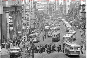 | <그림1> 노면전차 노선도 (1946) | <그림2> 시내를 운행중인 노면전차 (1960년대) |