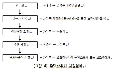 주택바우처의 지원절차로 자치구의 심의를 거쳐 보조대상자를 선정하는 방식에서 2010년 사회복지통합관리망을 통한 소득조사를 기초로 대상자를 선정하는 방식으로 바뀌었다