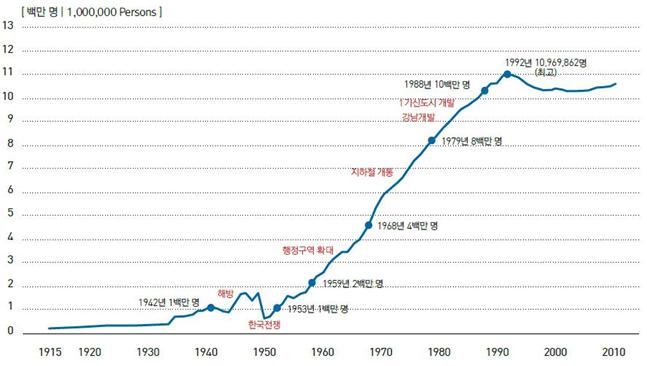 서울시 통계연보에 인구가 공식적으로 기록된 것은 1915년으로 이때 서울의 인구는 약 24만 명으로 기록되었다. 1936년에는 인구가 전년 대비 79.9% 증가하여 약 73만 명으로 늘어났는데 이것은 행정구역 확장 때문이었다. 서울의 인구는 1942년 처음으로 100만 명을 돌파하였고, 1945년 해방 후 일제의 강제징용으로 해외로 나갔던 동포들의 귀환과 월남동포의 서울 이주로 인구성장이 빠르게 진행되었다. 그러나 1950년 6월 25일 한국전쟁이 발발하면서 인구가 61.7% 감소하였고, 전쟁이 끝난 후 인구가 증가하면서 1953년 서울의 인구는 다시 100만 명이 되었다. 이후 정부의 적극적인 도시재건 노력으로 6년 만에 서울의 인구가 200만 명이 되었고, 1968년에는 400만 명, 1979년에는 800만 명에 이르렀다. 1980년대에도 강남지역의 개발과 함께 인구가 지속적으로 증가하였으며 이러한 인구증가 추이는 1990년대에 와서 둔화되었다. 서울시 인구는 1992년 1,097만 명으로 최고치에 도달한 이후 교외화 현상과 출산율 저하로 인해 감소하기 시작하였다. 2010년 말 현재 서울인구는 1,058만 명(주민등록인구 기준)으로 집계되었으며, 지난 20세기에 급속하게 증가했던 서울인구는 거의 100년 만에 안정단계에 들어서는 양상을 보이고 있다.
