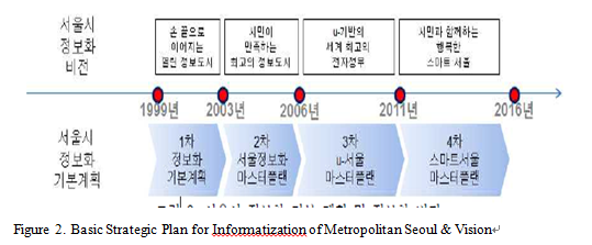 Since establishing Phase 1 of the Basic Strategic Plan in 1999, Seoul went on to develop 3 other phases, the fourth Smart Seoul Master Plan as the last, between 2011 and 2015. The city has been able to build the foundation for its e-Government and operate a globally leading e-Government system. In 2015, the Smart Seoul Master Plan developed in 2010 will be completed, with new ones to be established every 5 years pursuant to the City of Seoul Ordinance on Information.