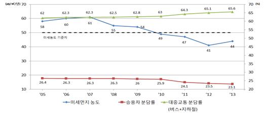 Seoul’s air quality has also improved thanks to the increased average travel speed, decreased transport share of personal cars, and increased share of public transport. The concentration of fine dust – a cause of respiratory diseases and a hotly debated social issue – was 60㎍/㎥ in 2004, 50㎍/㎥ higher than Seoul’s normal level. However, the decrease in passenger cars and other elements helped reduce the concentration each year, and by 2013 it had fallen to 44㎍/㎥.