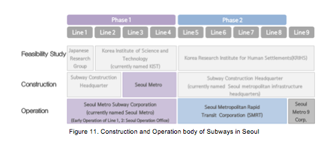 Various factors contributed to the success of the first phase subway system, while the most essential factors are as follow. First, most of decision makers such as the President, the National Assembly, and the Seoul Mayor had a great interest in the transportation issues, which became the driving force of promoting subway construction. Second, decision makers exactly evaluated the technological level of domestic civil engineering at the time and clearly distinguished the works that could be done with domestic technology and the areas that required foreign technology. Third, the strong will overcame the national economic crisis, which included the shortage of metals and oil crisis, and completed the construction in a short period of time. In particular, it was noteworthy to overcome the high inflation and wage increase rate that can be easily found in developing countries. Fourth, unstinting administrative support for the reduction of cost and duration was effective. For example, in order to facilitate the construction work, Euljiro, a major trunk road in Seoul was closed to traffic except buses during the construction period. Lastly, plan was modified when it was required in the future prospects and aggressive investment was made in the facilities. Currently, Seoul’s subway system is in a world-class in terms of scale and transportation performance, which was possible because the facility size was modified during the construction stage to have a large-scale system with 210 meter platform and 10 cars per one ride.
